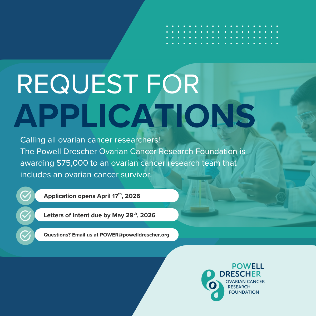 Our 2026 Request for Abstracts is officially OPEN! We are pleased to announce the Pilot Grant Award to encourage preliminary research projects in all areas of ovarian cancer research including, but not limited to: cancer biology, genetics, early detection and prevention, treatment, cancer care delivery, and public health sciences. New concepts, novel approaches, and/or projects that extend previous discoveries and have potential to develop into larger projects are encouraged. Learn more about our grant application guidelines using the guide linked below.
